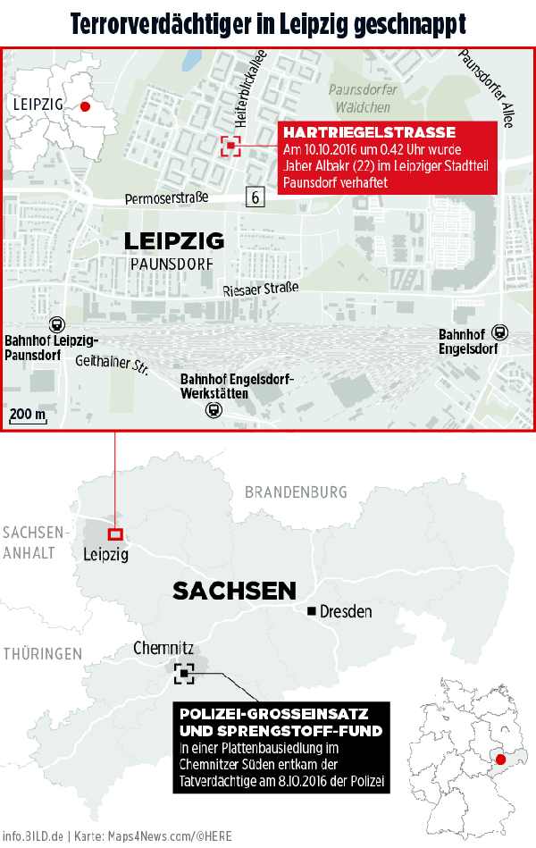 德国当地时间周一(10月10日)凌晨6点多,德国警方通过Twitter和Facebook公布消息,称已在莱比锡抓获试图策划炸弹袭击的叙利亚难民Dschaber al-Bakr。此前,警方在其住所发现了强力爆炸物。 ![]() ▲德国警方已将叙利亚嫌犯Dschaber al-Bakr(左)成功逮捕 上周六(10月8日),德国警方在东部城市开姆尼茨的Plattenbau城区目击了这名有策划炸弹袭击嫌疑的叙利亚人,并对其发出了警告性的射击,然而并未能抓捕他。 随后,警察搜查了他的住房,并找到了十分隐蔽的数百**力炸药,炸药的潜在威力很大。警方随即封锁了开姆尼茨火车站,拘留了3名跟嫌犯有联系的男子,并向全国展开针对嫌犯的通缉。 ▲警方通过阳台进入嫌犯藏身之处 开姆尼茨潜逃,莱比锡被捕 据警方消息,嫌犯al-Bakr被捕的具体位置是莱比锡北部城区Paunsdorf的街道Hartriegelstraße。 ▲红色方框处即嫌犯被逮捕的位置 据《图片报》称,他在莱比锡曾向两名叙利亚人借宿,后者以为他是流浪汉而答应让他借住。但当他们得知嫌犯被警方通缉的消息后立即报了警。直到警察抵达之前,他们一直在牵制住al-Bakr。 凌晨0点42分,据现场一名警官透露,抓捕行动十分顺利。 ▲抓捕行动顺利进行 民间积极配合警方 据欧时网报道,警方在对嫌犯住所搜查后,呼吁公众提高警惕,同时欢迎民众提供宝贵线索。仅仅截至9日,警方已经收到80多条来自民间的侦查线索。萨克森州刑侦署发言人同时警告说,这位叙利亚嫌犯非常危险,“我们希望尽快将其逮捕”。 据德国官方消息,嫌犯al-Bakr于2015年2月18日以难民身份进入德国,两周后就获得德国当局的庇护许可,并于6月中旬被认定为难民。 ▲2015年,德国涌入了大量叙利亚难民 Dschaber al-Bakr于1994年出生在叙利亚,据悉有极端伊斯兰背景。警方是7日从宪法保护局得到了相关提示,并立即于8日采取搜捕行动的;宪法保护局的消息则来自情报机构。 在捕获嫌犯之前,开姆尼茨所在的萨克森州警方曾书面声明:“搜捕嫌犯的工作仍在继续,目前嫌犯还没有落网,我们不知道他身在何处,也不清楚他随身携带着什么物品,大家要多小心!” ▲警方封锁嫌犯藏身现场 距离开姆尼茨260公里之外的德国首都柏林也曾加强了安保,柏林舍内菲尔德机场(Schoenefeld)增派了警员,在安检处进行额外的抽查,过往车辆也被警察拦截进行抽查。 今年以来,德国警方已经挫败多起袭击事件。2月,警方发现一个小团伙正筹划在柏林制造恐袭。6月,德国警方逮捕了一名涉嫌计划在杜塞尔多夫制造袭击的嫌犯,该嫌犯或为“伊斯兰国”成员。上个月,一名来自叙利亚的16岁难民在科隆被捕,警方掌握的信息显示,这位青年在网络聊天室和一位境外人士密切联系,并获得了如何制造炸弹的指令。 转载自欧洲时报,公众号GermanReport |