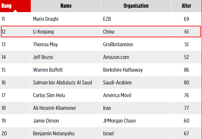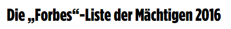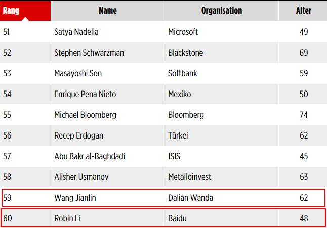 昨天,德国各大媒体上都静悄悄地放上了一份2016福布斯最有权势排行榜。。。 然而,相信大家都猜到了,第一名。。。 他就是战斗民族大帝,普京。。。 而美国下任总统,我们的方言君~特朗普大爷刚当选就排到了第二~ 而我们亲爱的老朋友默大妈也没有另大家失望,夺得了第三名的好名次~ 我们亲爱的“习大大”,也不负众望,名列第四。 一同上榜的还有不少我们的老面孔~ 比如。。。 我们的国民父亲马云爸爸~ 在这里不得不提一下,日本首相安倍晋三的排名是37,比马云爸爸(28)还要后。。。 国民表情包**此次的排名是43,不知道他对这个排名可否满意~ 而奥巴马在新一任美国总统出炉后,影响力显然大不如前,跌到了48名~ 排在57位的是极端伊斯兰恐怖主义组织“伊斯兰国”的首领,现任“伊斯兰国”的“哈里发” 巴格达迪,全名易卜拉欣·阿瓦德·阿里·穆罕默德·巴德里·萨玛拉·阿布·贝克尔·巴格达迪 (手动微笑) 而我们的国民公公王健林和百度创始人李彦宏则分别排名59和60位~ 下面放上排行榜~(排行榜上的中国人小编都已经给大家标记啦!!!) ![]() 小编在这里标注一下前十名的中文名~ 第一名:现任俄罗斯总统 弗拉基米尔·弗拉基米罗维奇·普京 第二名:美国第45任总统当选人 唐纳德·特朗普 第三名:现任德国联邦总理 安格拉·默克尔 第四名:中华人民共和国国家主席 习** 第五名:现任罗马主教 方济各 第六名:美联储主席 珍妮特·耶伦 第七名:美国微软公司联合创始人 比尔·盖茨 第八名:Google创始人 拉里·佩奇 第九名:现任印度总理 纳伦德拉·莫迪 第十名:Facebook创始人 马克·扎克伯格 排行榜上的中国面孔还是挺多的~小编感到由衷的自豪呀~(撒花~) |