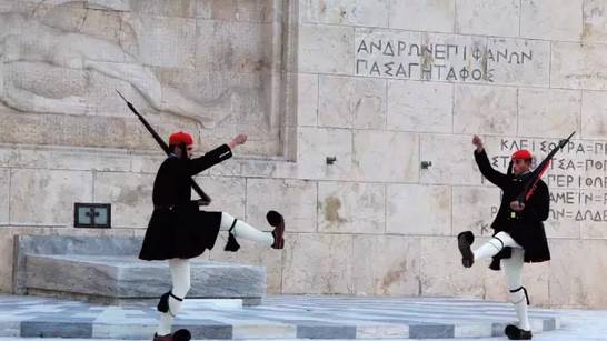 这些卫兵有个名字叫做埃夫佐尼(Evzones)。这个词最早出现在古希腊伟大诗人荷马的《伊利亚特》,意为“穿着结实腰带的”人,表示他们是精锐。他们的制服很有特点:头戴佩有黑色流苏的红帽、着褶裥裙、穿佩黑色流苏的白色羊毛袜、脚上则有一双前面带大绒球的萨洛伊鞋(Tsarouhi)。除了服饰,埃夫佐尼换岗时的动作也比较夸张,算是雅典游的一个特色。