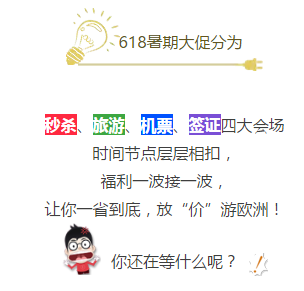 (小元语录:盯紧618,其他也要抓) 旅游线路限量秒杀 ❖活动时间:2017.6.16-2017.6.20 活动期间秒杀价格低至61.8欧哦! 6月16日 ![]() (更多预告点击阅读原文查看吧~) 零元签证服务费限时秒杀活动细则 时间:2017.6.16-6.20 形式:活动期间,每天限量5名,限时秒杀 ![]() 早报名早优惠 提早一天就优惠1欧哦! 活动细则 时间:2017.6.10-6.17 规则:官网全场自营线路8月31日之前所有团期,活动期间内提早报名一天优惠1欧! 自下单之日起距发团的天数为优惠总金额,下单时备注【618早优惠】,待客服改价后立享折扣。 聚友套餐,四人同行一人免单! 活动细则 时间:2017.6.18-6.20 规则:活动期间内报名全场自营线路,备注【618四免一】 *相同线路产品即可享受第4人报名免团费! *不同线路产品4人报名可免最低产品价格! 私家团—家庭出游 儿童免费活动细则 时间:2017.6.10-6.20 规则:活动期间内报名私家团线路时备注【618私家团】,即可享受家庭出游儿童免费!(6岁以下儿童适用) ![]() 宝宝免票开始啦活动细则 时间:2017.6.10-6.20 规则:活动期间预订德国始发机票,可以免费赠送一张同行程的宝宝票(2周岁以下的婴儿,且预订的是婴儿票,仅限普通经济舱) 免费形式:支付机票款项时,无需支付婴儿票的金额 免费名额:不限 圣诞出游先人一步 ![]() ![]() ![]() ![]() 【北京领区】申根签证900元/人活动细则 时间:2017.6.10-6.20 价格:原价1000元/人 现价900元/人 规则:活动期间购买北京领区申根签证即可享优惠价,该价格不含保险。 更多精彩, 尽在开元618~ 长按解锁解锁更多精彩内容 |